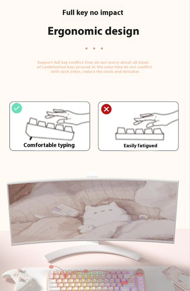- Estructura GASKET y triple absorción acústica: Experimenta una mecanografía superior con la triple absorción acústica, que incluye algodón acústico, una almohadilla inferior en el eje x y algodón inferior que absorbe el sonido. Este diseño elimina los sonidos de cavidad y reduce el ruido de las colisiones de las teclas, ofreciendo una experiencia de tecleo suave y silenciosa.
