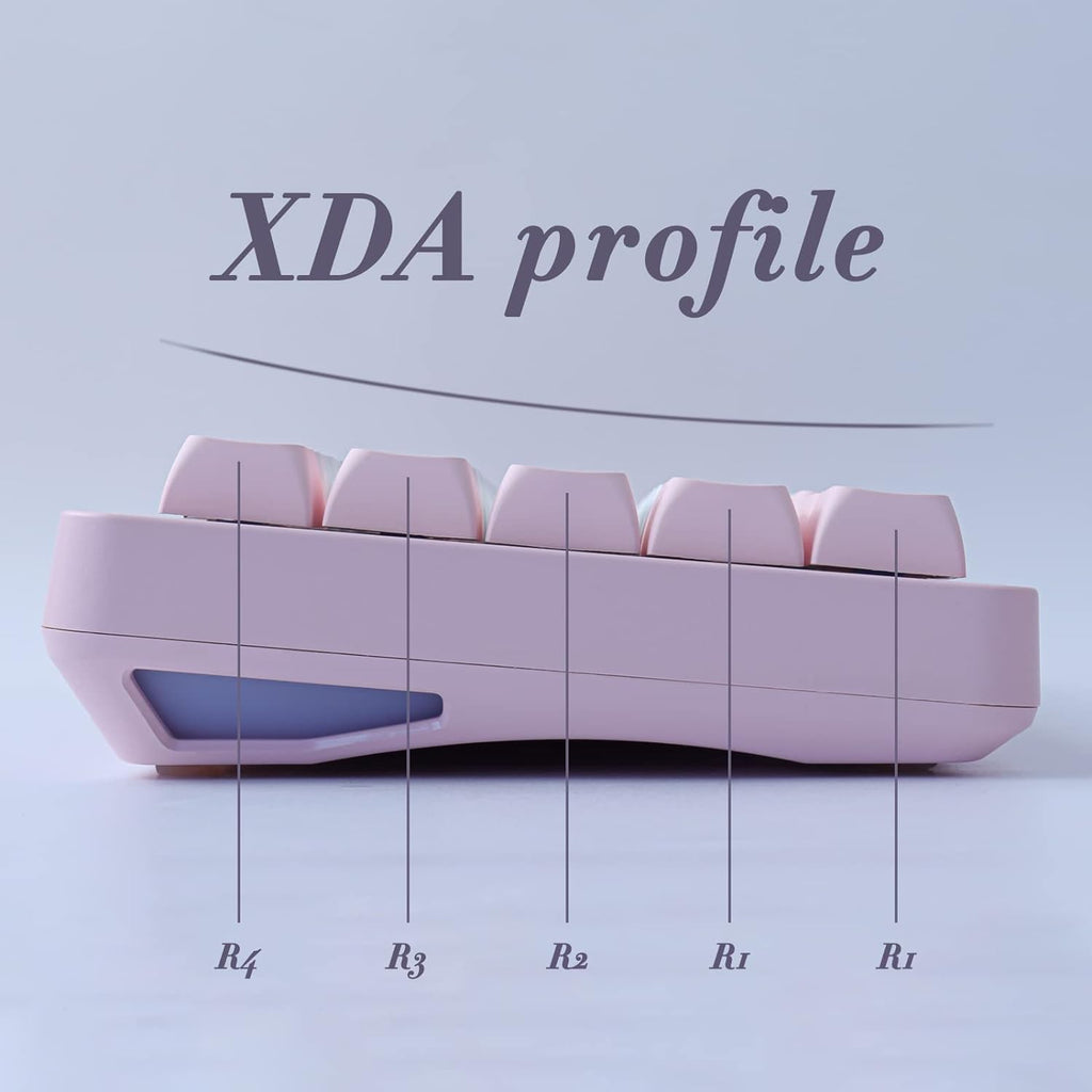 ✦ Perfil: XDA, y cada tecla tiene la misma altura. La parte superior de la tecla es relativamente ancha, lo que puede darte una experiencia de escritura muy cómoda. Al igual que el DSA, las teclas XDA son de perfil bajo y uniforme, lo que hace que los usuarios prefieran este perfil, ya que tiene un aspecto estupendo. El sonido es similar al del perfil Cherry, pero un tono más bajo. Este perfil se considera una opción sólida tanto para juegos como para escritura rápida/regular.