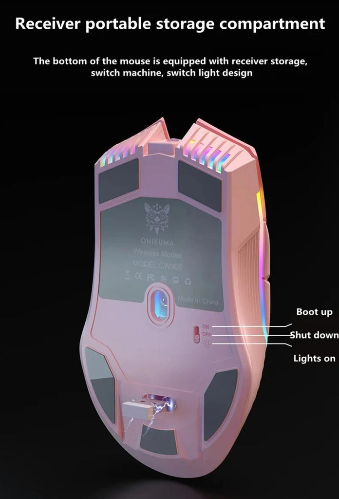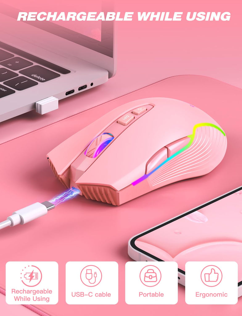 So pretty! Such a pretty pink. RGB is so vibrant and has many options to choose! Feels great. USB stick is underneath the mouse and its so useful being wireless and feels really smooth.